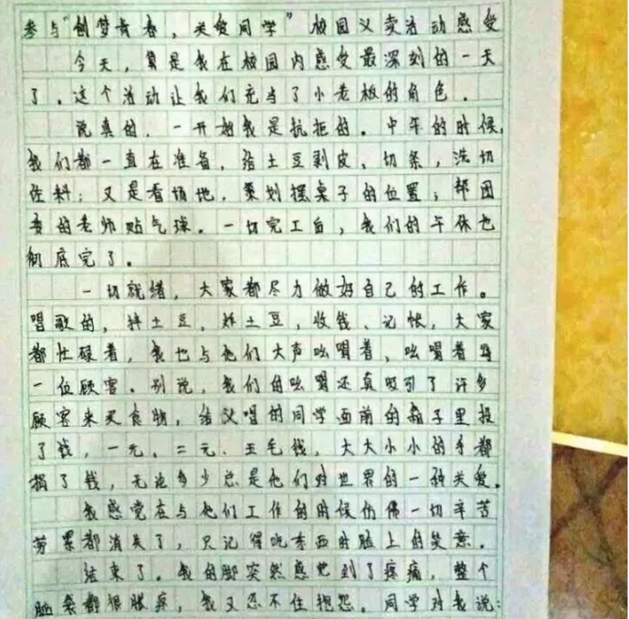 今天算是我在学校内感受最深刻的一天,这个活动让我充当了小老板的角色,说真的,一开始我是抗拒的,中午的时候我们都一直在准备,给土豆拨皮、切条、洗切作料,又是看场地策划摆桌子的位置,帮老师贴气球,一切完工,我们的午休也彻底完了。一切就绪,大家都尽力的做好自己的工作,唱歌的、拌土豆的、炸土豆的、收钱、记账,大家都忙碌着。我也与他们大声吆喝着,吆喝着每一位顾客,别说我们的吆喝还真吸引了许多顾客来买食物,给演唱的同学面前的箱子里投钱,一元、2元、5毛钱,大大小小的手都在捐钱。