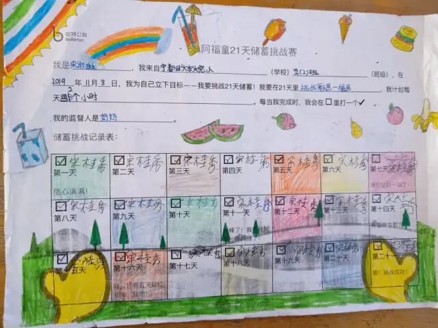 在此期间,我们还参与了阿福童的许多活动,比如:奇乐生存挑战包、国际储蓄周涂鸦挑战赛、暑期记账本等,令我印象最深刻的是秋学期的“21天储蓄挑战赛”。