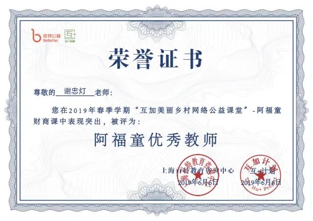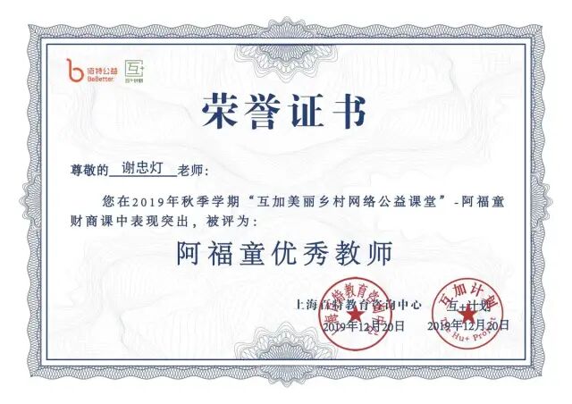 在学期末,我校共有7位老师先后获得2019年春学期和秋学期“阿福童优秀教师”。
